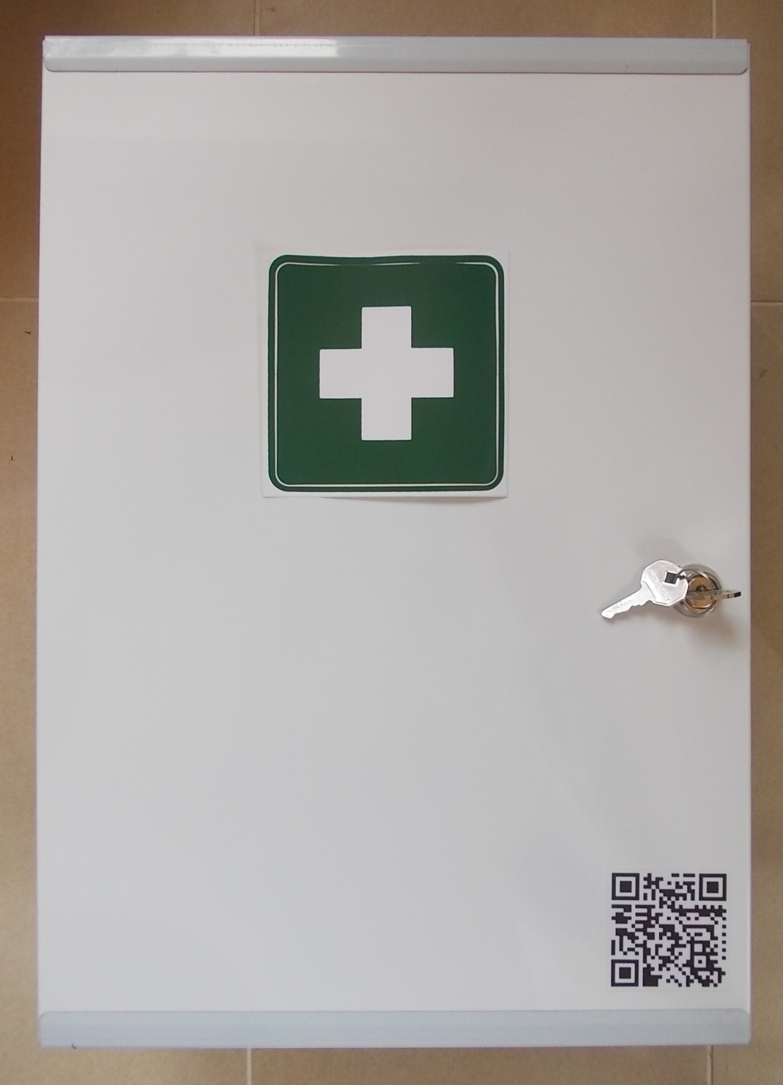 Farbe: Perlweiß, Maße: 320x190x450mm, 1-türiger Stahlblechschrank mit 4 Einlegeböden, Türverschluss mittels Sicherheitsschloss, 2 Schlüssel, einbrennlackiert, mit Erste-Hilfe-Aufkleber